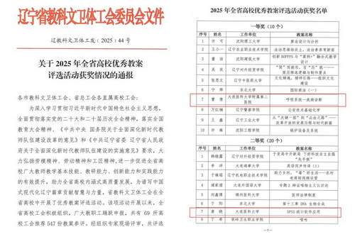 近日,由辽宁省教科文卫体工会主办的 2025 年全省高校优秀教案评选结果正式揭晓。经过专家严格评审,我校申报的两份教案在 69 所参赛高校推荐的547 份教案中脱颖而出,喜获殊荣:附属第二医院曹倩老师申报的教案《呼吸系统——疾病诊断》斩获一等奖,公共卫生学院唐晓老师申报的教案《SPSS统计软件应用》荣获二等奖。